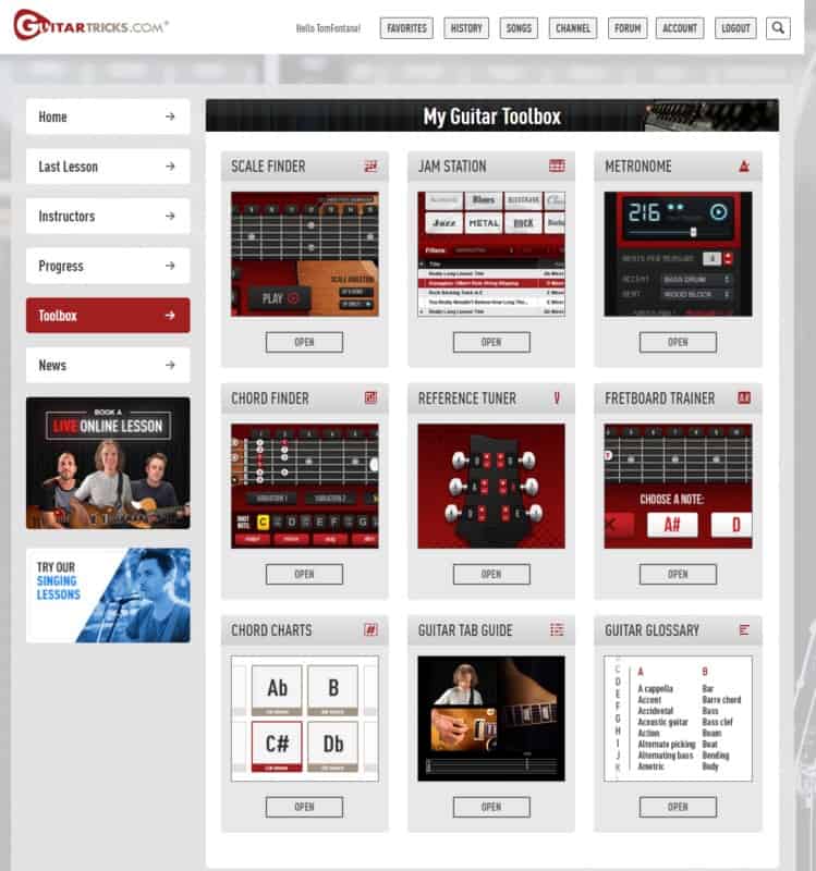 | 1. Guitar Tricks (December 2025 discounts and free trial) | Beginner Intermediate Advanced | Chord library Scale library Jam tracks Metronome Tuner Guitar games | 1000+ popular songs | Monthly: $19.95 Yearly: $143.20 after coupon |