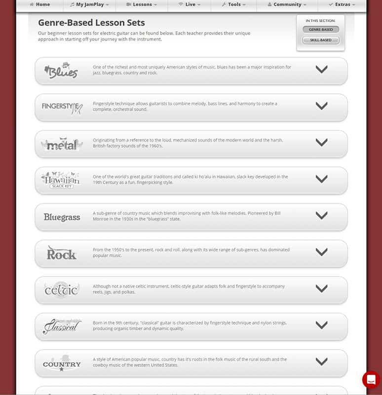 These 4 genre courses are well thought out and structured, just like their beginner material. If you are a total beginner and aim to learn to play rock guitar, blues guitar, or country guitar, progressing through these lessons will get you to a strong intermediate level.